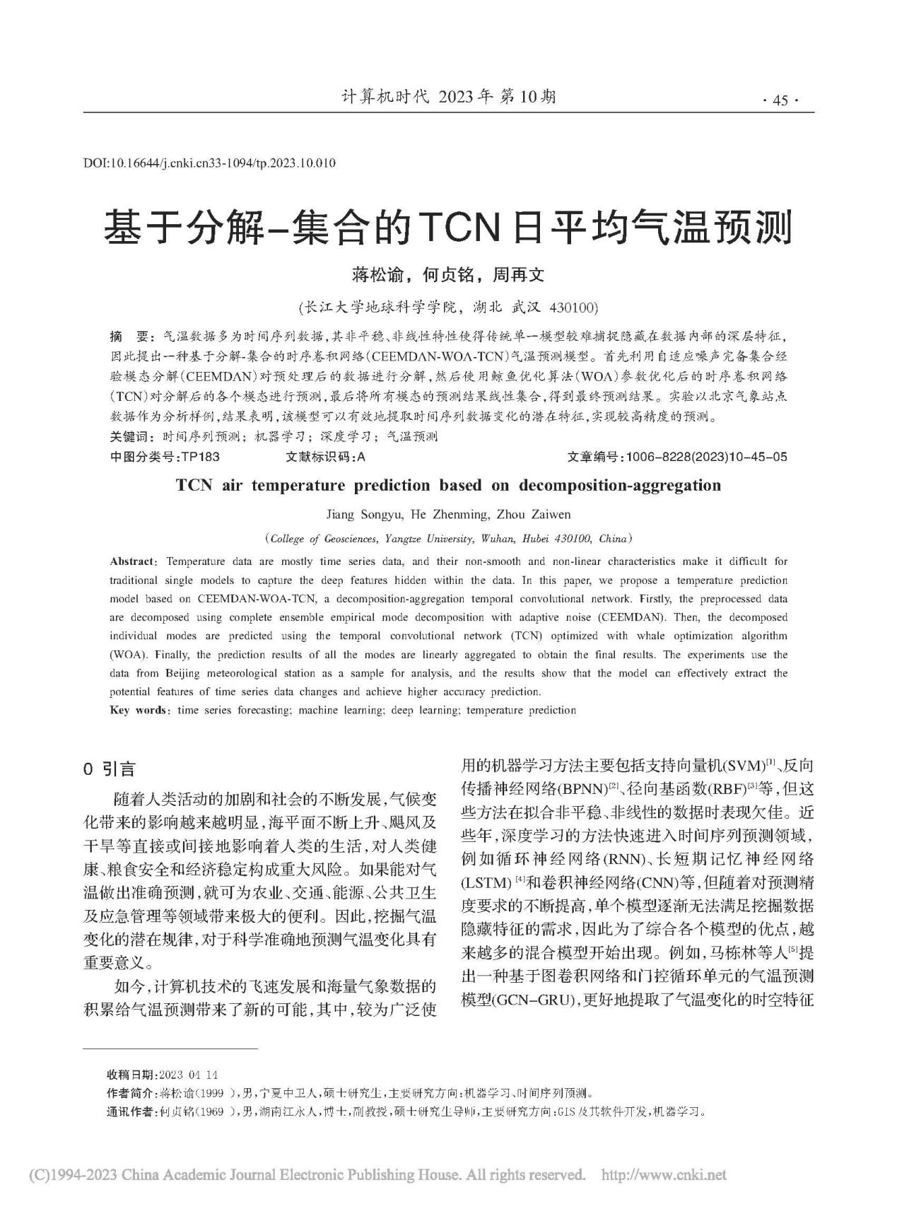 地科学院何贞铭副教授团队长期从事GIS、RS应用的研究,团队成员蒋松渝在期刊《计算机时代》上发表题为“基于分解-集合的TCN日平均气温预测”的研究论文。澳门十大网投正规官网平台为论文第一署名单位,硕士研究生蒋松渝为论文第一作者,其导师何贞铭副教授为该文通讯作者。
