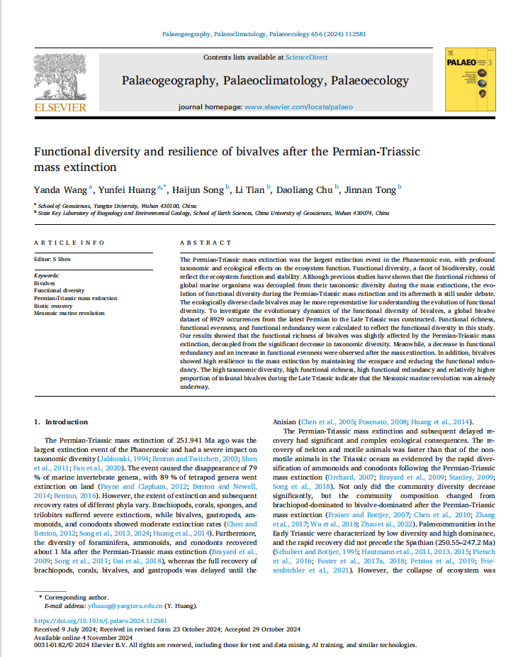 地科学院黄云飞教授团队长期从事古-中生代之交重大地质转折期生物灭绝与生物复苏方面的研究,团队成员王延达在古生物学国际1区SCI期刊《Palaeogeography, Palaeoclimatology, Palaeoecology》上发表题为“Functional diversity and resilience of bivalves after the Permian-Triassic mass extinction”的研究论文。澳门十大网投正规官网平台为论文第一署名单位,硕士研究生王延达为论文第一作者,其导师黄云飞教授为该文通讯作者。
