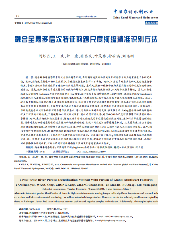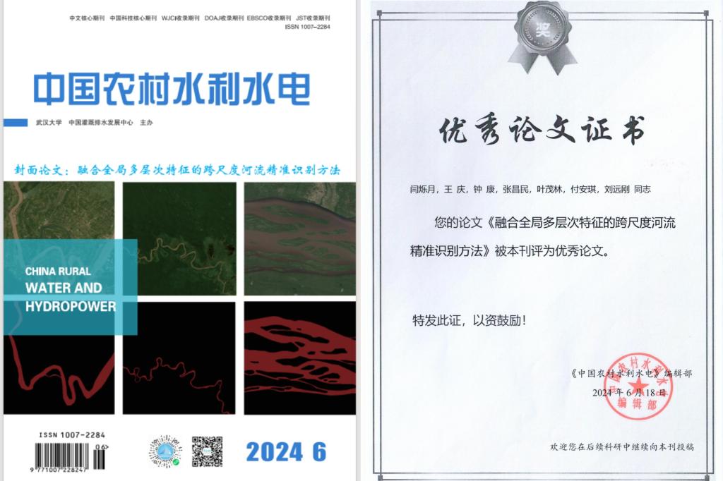 澳门十大网投正规官网平台地信系硕士研究生闫硕月(指导老师:王庆)在《中国农村水利水电》上发表题为“融合全局多层次特征的跨尺度河流精准识别方法”的研究论文。该论文被该期刊评为优秀论文,并作为2024年第6期的封面论文。