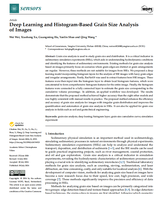 十大网投正规官网魏薇博士在国际学术期刊《Sensors》上发表了题为“Deep Learning and Histogram-Based Grain Size Analysis of Images”的SCI论文,提出了一种创新的基于深度学习和直方图分析的图像粒度识别方法。该研究不仅在理论上具有创新性,而且在实际应用中展现了显著的效率与准确性,为沉积模拟实验中的粒度分析提供了新的技术路径。