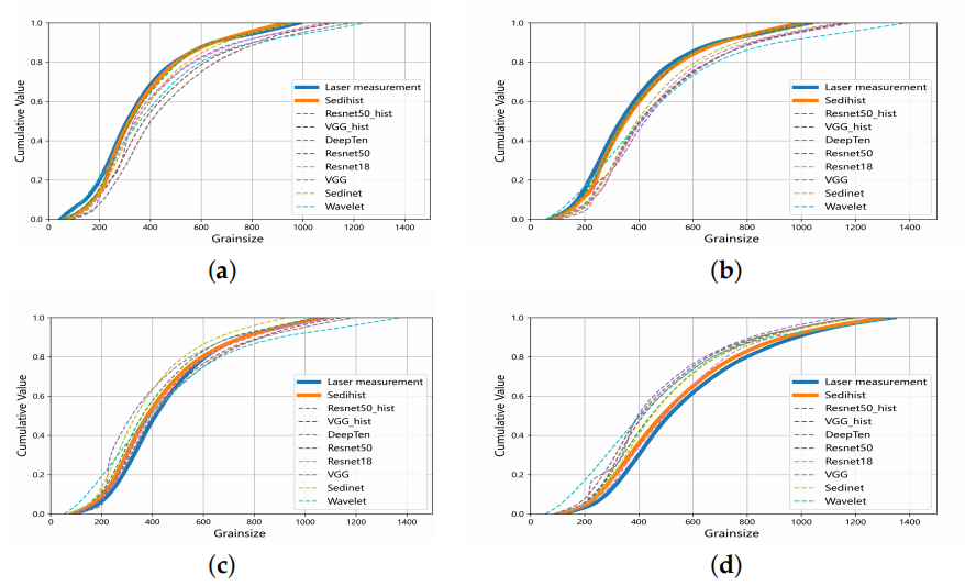 该博士团队针对传统图像粒度分析方法在处理边缘模糊及粒径排列不规则时的局限性,提出了一种结合深度学习与直方图分析的改进方法,以提高对不规则粒径分布图像的粒度分析效率和准确性。研究中,首先使用ResNet18网络从沉积模拟实验图像中提取特征,然后将这些特征输入直方图层以获得局部直方图特征,最终通过全连接层估算对应的累积体积百分比的粒径。实验结果表明,所提出的方法在实际应用中与激光粒度仪测量结果高度一致,且比其他八种模型具有更高的准确性。该研究不仅提高了沉积模拟实验中粒度分析的量化和自动化水平,而且对于土壤和岩土工程等领域的粒度分析提供了潜在的应用价值。