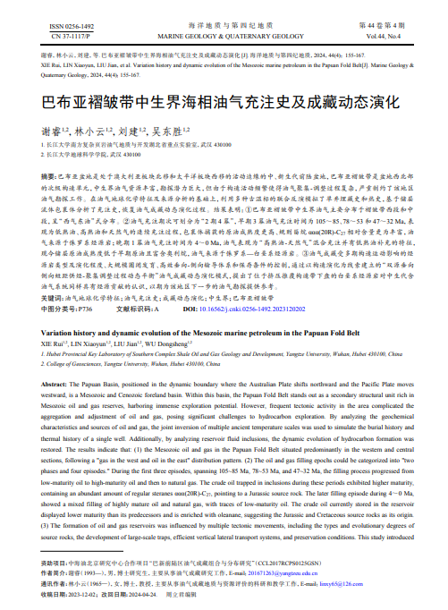 澳门十大网投正规官网平台谢睿博士在十大网投正规官网林小云教授的指导下,在地质学领域期刊《海洋地质与第四纪地质》上发表题为“巴布亚褶皱带中生界海相油气充注史及成藏动态演化”的研究论文。