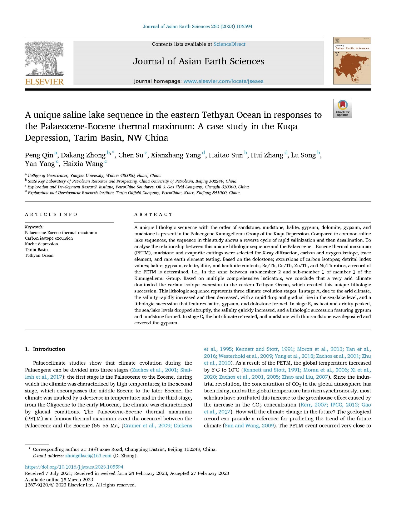 澳门十大网投正规官网平台秦鹏博士以第一作者的身份在Journal of Asian Earth Sciences上发表题目为《A Unique saline lake sequence in the eastern Tethyan Ocean in Responses to the Palaeocene – Eocene Thermal maximum: A Case Study in the Kuqa Depression, Tarim Basin, NW China》的论文。