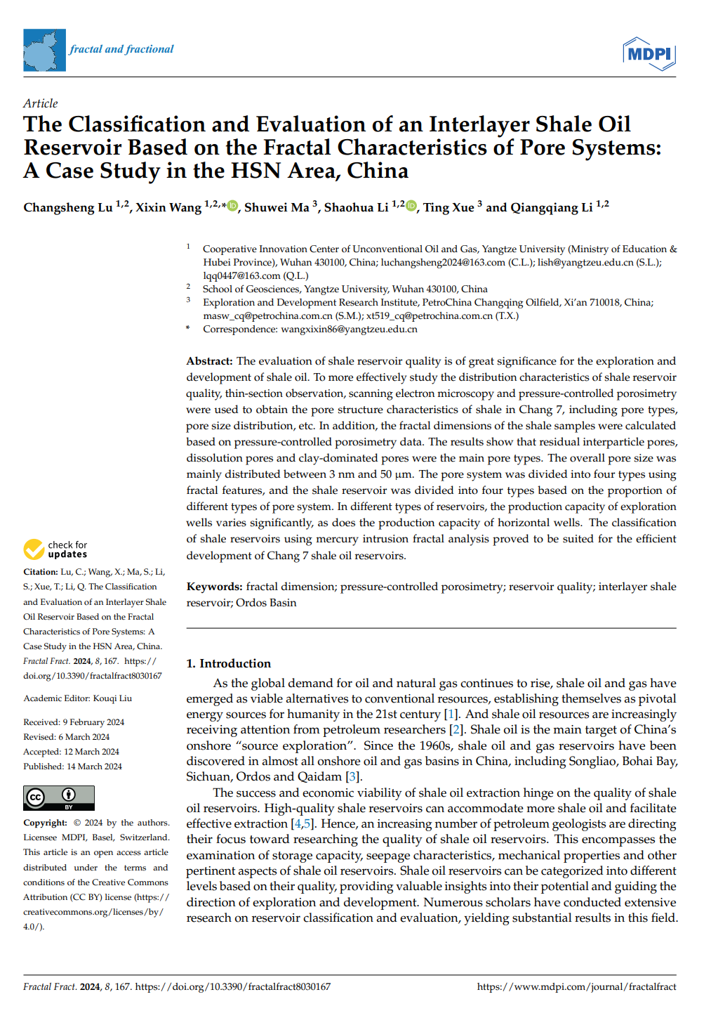 澳门十大网投正规官网平台石油系王喜鑫博士在石油地质学领域主流期刊《Fractal and fractional》上发表题为“TheClassiffcationand Evaluation of an Interlayer Shale Oil Reservoir Based on the Fractal Characteristics of Pore Systems: A Case Study in the HSN Area, China”的研究论文。