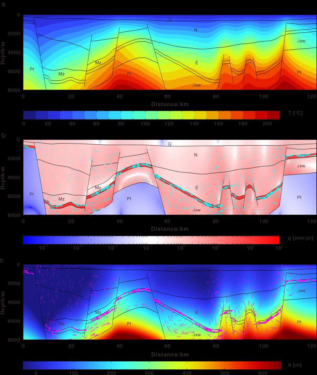 通过温度场、水动力场耦合数值模拟,研究聚焦冀中坳陷岩溶热储强迫对流和自由对流联合作用模式及其聚热效应,同时系统研究了岩溶热储层厚度、渗透率及断裂带宽度对岩溶热储聚热效应的影响。二维有限元数值模拟结果表明,地形驱动流体可以推动自由对流单元向坡下滚动,强化了地下水对流的聚热效应。岩溶型地热系统中,随着岩溶层厚度、渗透率和断层宽度增加,会导致如下结果:上游冷水补给增强,导致岩溶层平均温度降低;热上升流向流域下游方向推进;流域上游地表热通量降低,而下游热通量增加,即岩溶热储地下水对流活动的聚热效应增强。研究成果对于深化岩溶型地热系统形成机理研究具有重要意义,为进一步探索类似地质条件下地热能形成与演化提供了科学依据和技术方法。