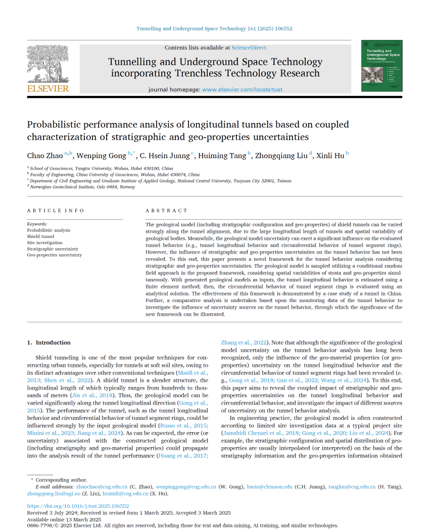 澳门十大网投正规官网平台特任教授赵超在《Tunnelling and Underground Space Technology》发表题为“Probabilistic performance analysis of longitudinal tunnels based on coupled characterization of stratigraphic and geo-properties uncertainties”的研究论文(图1)。赵超为第一作者,澳门十大网投正规官网平台为第一完成单位。