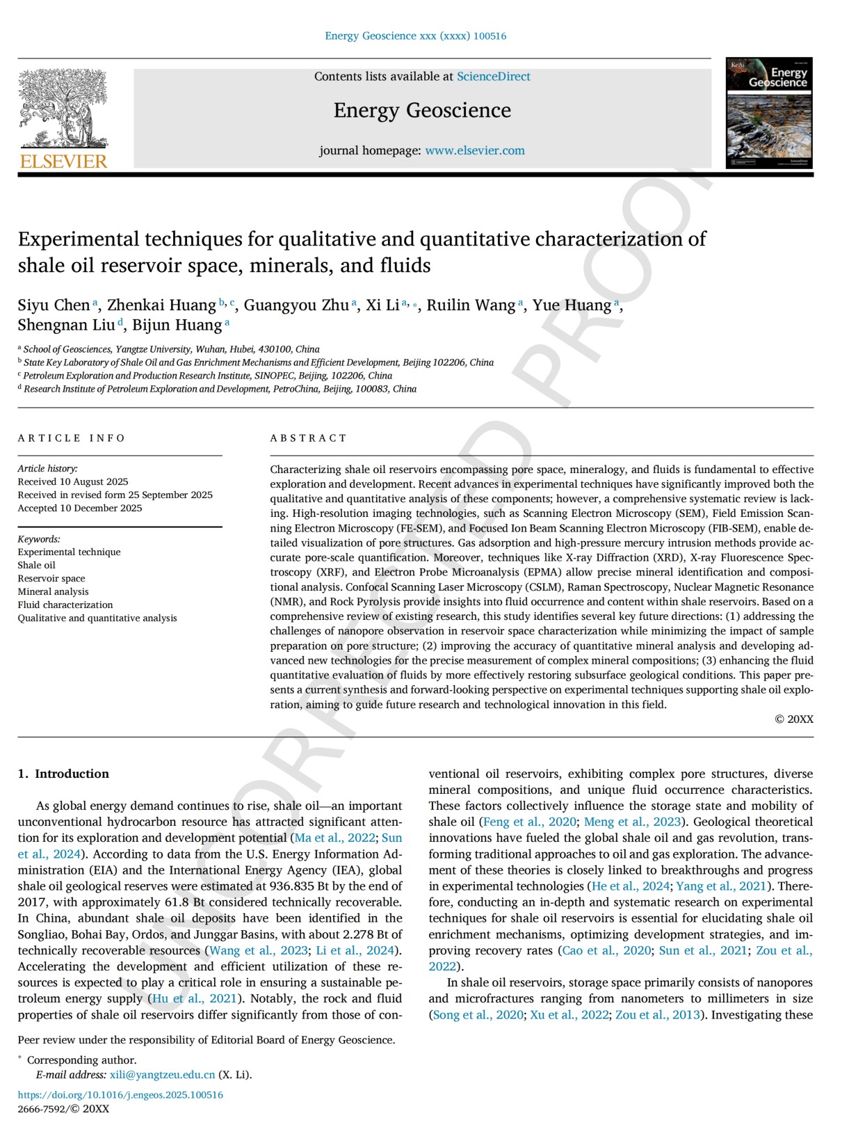 近日,地科学院2025级地质资源与地质工程专业硕士研究生陈思钰以第一作者身份在《Energy Geoscience》上发表了题为“Experimental techniques for qualitative and quantitative characterization of shale oil reservoir space, minerals, and fluids”的研究论文。澳门十大网投正规官网平台为第一完成单位和通讯作者单位。