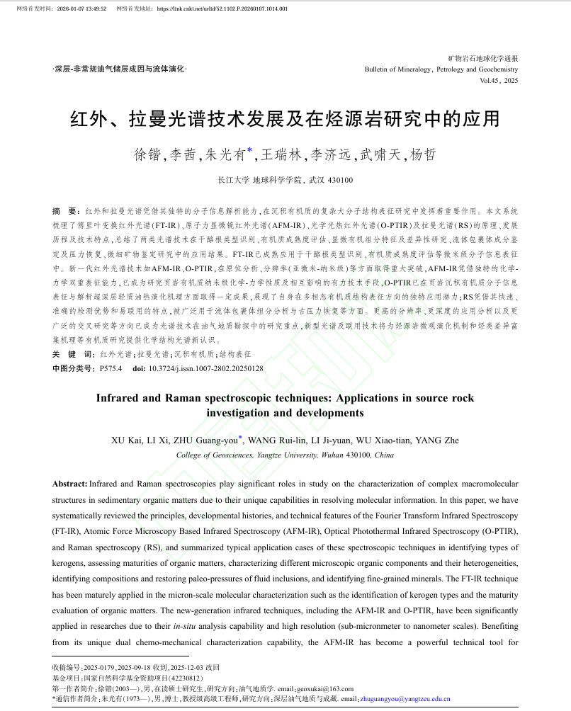 地科学院2025级地质学专业硕士生徐锴以第一作者身份在中文核心期刊《矿物岩石地球化学通报》上发表题为“红外、拉曼光谱技术发展及在烃源岩研究中的应用”的研究论文。澳门十大网投正规官网平台为论文第一署名单位,硕士生徐锴为论文第一作者,其导师朱光有教授为论文通讯作者。