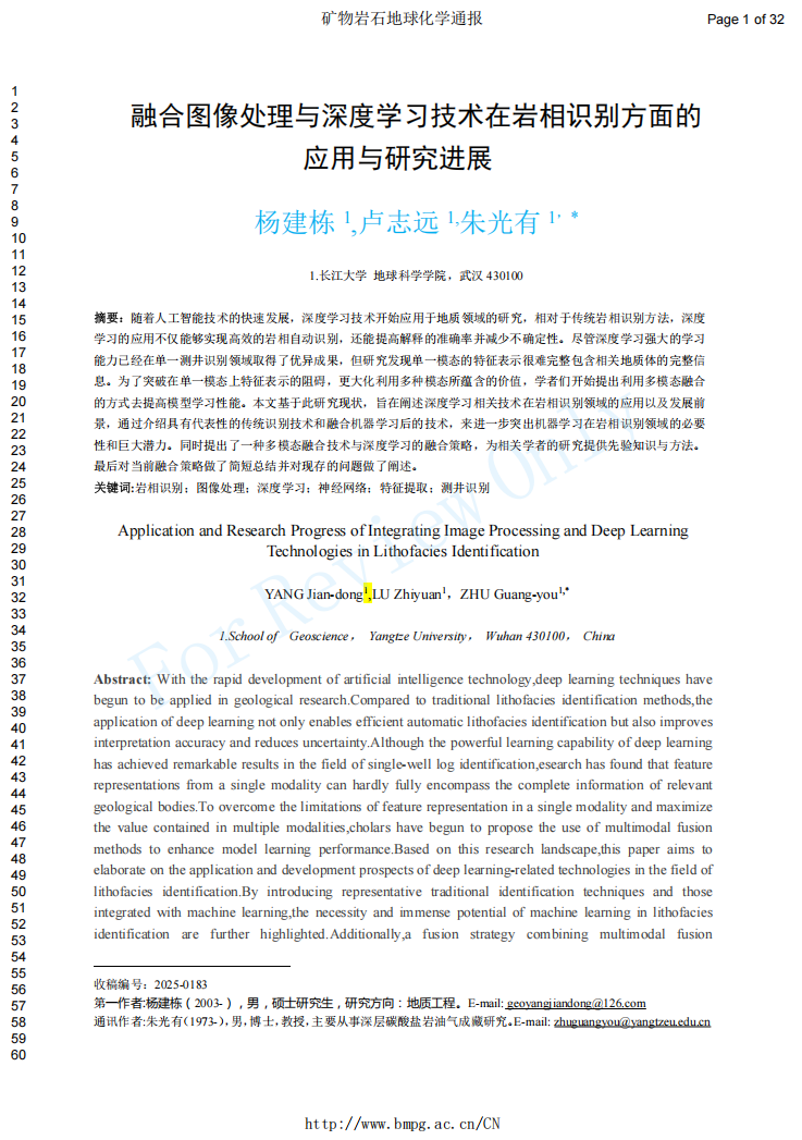 地科学院2025级地质工程专业硕士生杨建栋以第一作者身份在中文核心期刊《矿物岩石地球化学通报》上发表题为《融合图像处理与深度学习技术在岩相识别方面的应用与研究进展》的论文。澳门十大网投正规官网平台为论文第一署名单位,硕士生杨建栋为论文第一作者,其导师朱光有教授担任论文通讯作者。