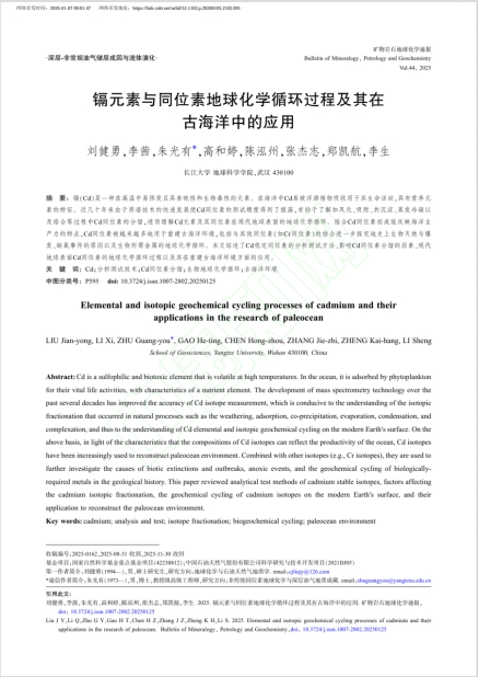 地科学院2025级地质学专业博士生刘健勇以第一作者身份在中文核心期刊《矿物岩石地球化学通报》上发表题为《镉元素与同位素地球化学循环过程及其在古海洋中的应用》论文。澳门十大网投正规官网平台为论文第一署名单位,博士生刘健勇为论文第一作者,其导师朱光有教授担任论文通讯作者。
