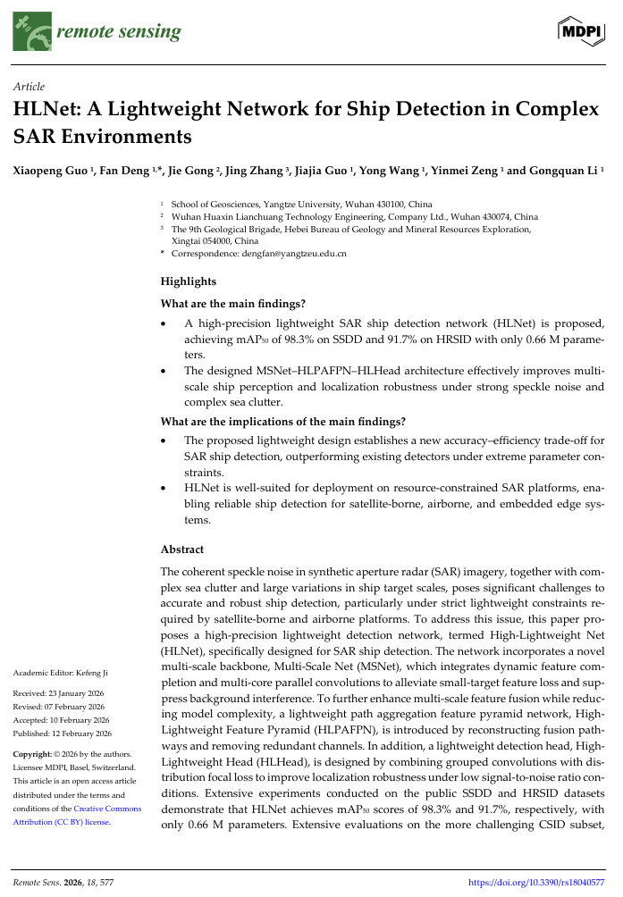 澳门十大网投正规官网平台2024级研究生郭晓鹏在遥感与地球科学领域期刊《Remote Sensing》(中科院2区)发表题为“HLNet: A lightweight network for ship detection in complex SAR environments”的研究论文。澳门十大网投正规官网平台为论文第一署名单位,研究生郭晓鹏为论文第一作者,其导师邓帆为论文通讯作者。