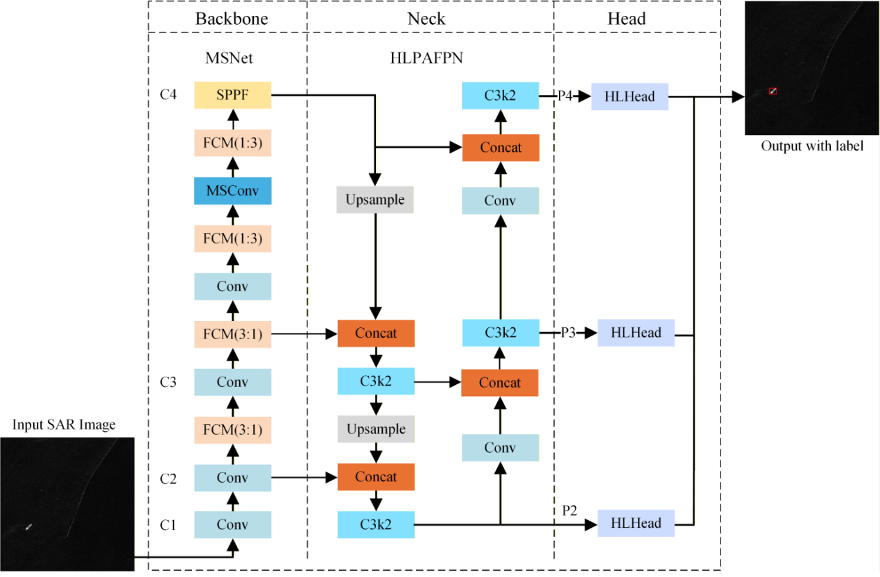论文提出了一种用于SAR船舶检测的高效率轻量级网络架构。合成孔径雷达(SAR)图像中的相干斑点噪声,加之复杂的海杂波以及舰船目标尺度的巨大变化,给精确且稳健的舰船检测带来了重大挑战,尤其是在星载和机载平台所要求的严格轻量化约束条件下。为解决这一问题,本文提出了一种高精度轻量化检测网络,称为 High-Lightweight Net(HLNet),专门用于 SAR 舰船检测。该网络集成了一种新颖的多尺度骨干网络——Multi-Scale Net(MSNet),该骨干网络融合了动态特征补全和多核并行卷积,以减轻小目标特征损失并抑制背景干扰。为在降低模型复杂度的同时进一步增强多尺度特征融合,本文通过重构融合路径和去除冗余通道,引入了一种轻量化路径聚合特征金字塔网络High-Lightweight Feature Pyramid(HLPAFPN)。此外,本文还设计了一种轻量化检测头High-Lightweight Head(HLHead),它将分组卷积与分布焦点损失相结合,以提高低信噪比条件下的定位稳健性。在公开的 SSDD 和 HRSID 数据集上进行的大量实验表明,HLNet 仅用 0.66M 参数,就分别达到了 98.3% 和 91.7% 的 mAP50分数。在更具挑战性的 CSID 子集(由从 SSDD 和 HRSID 中选取的复杂场景组成)上进行的广泛评估显示,HLNet 的 mAP50达到 75.9%,比基线高出 4.3%。这些结果表明,HLNet 在检测精度和计算效率之间实现了有效的平衡,使其非常适合部署在资源受限的 SAR 平台上。