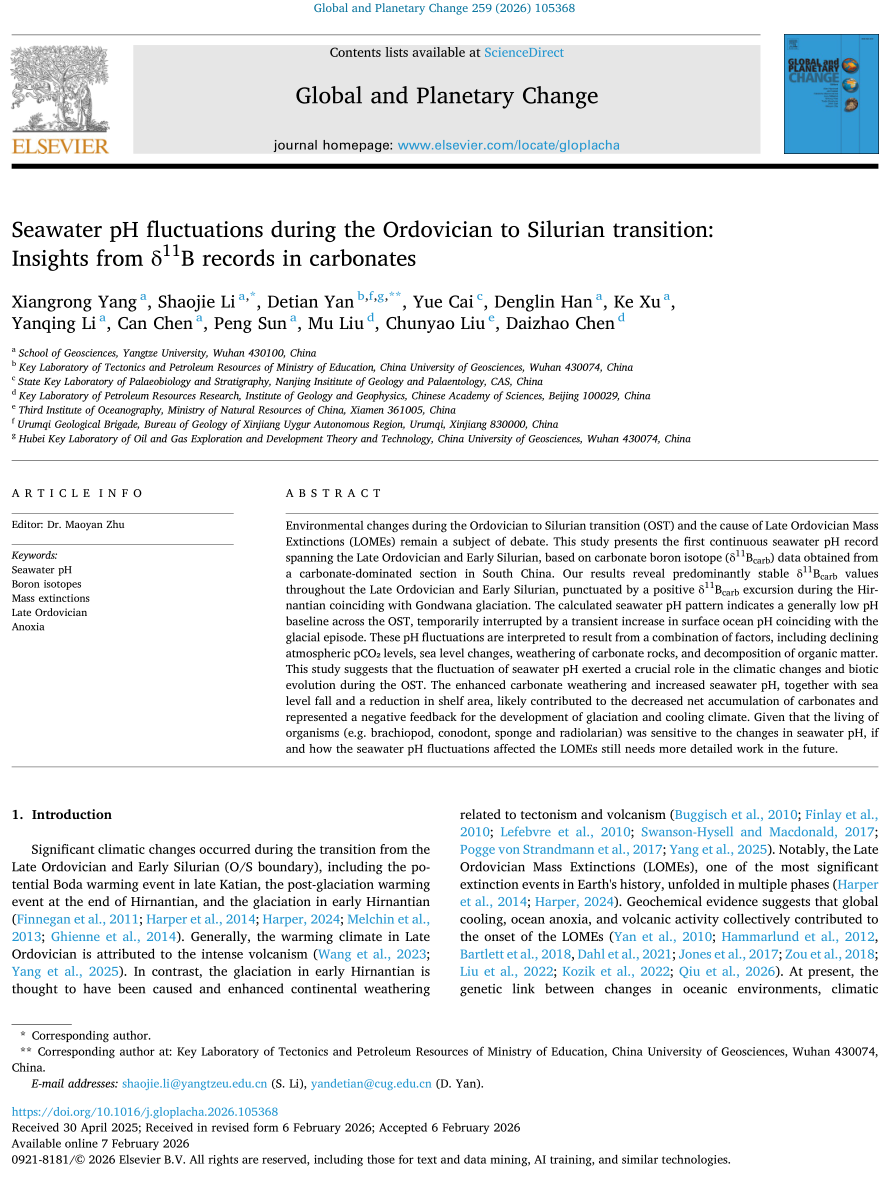 十大网投正规官网澳门十大网投正规官网平台杨向荣副教授在中科院一区期刊《Global and Planetary Change》发表题为“Seawater pH fluctuations during the Ordovician to Silurian transition:Insights from δ11B records in carbonates”的研究论文,澳门十大网投正规官网平台李劭杰特任教授为第一通讯作者,第一署名单位为澳门十大网投正规官网平台(图1)。论文介绍了奥陶纪-志留纪这一重要地质历史转折期内的古气候条件转变过程,及其影响下的表层海水酸碱度(pH)值变化和生物演化过程。