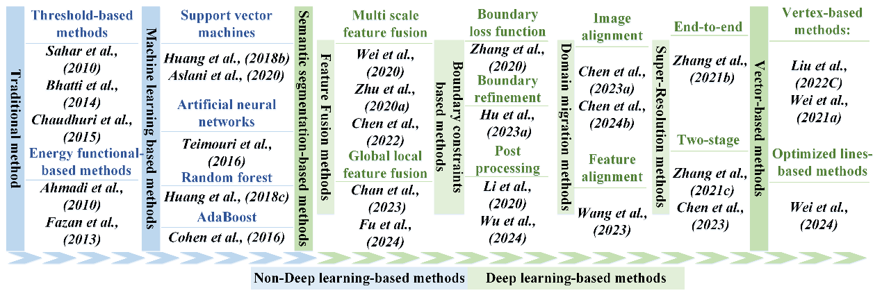 该研究回顾了 243 篇论文,以确定未来的研究趋势,并强调基于 HRSI 的建筑物提取的五个关键挑战:复杂的边界优化、形状和光谱变化、样本不足、树木和阴影干扰以及轻量级模型应用。随后,我们利用先进的深度学习技术探索了五个相应的机会。现有方法主要分为两大类:基于非深度学习的方法和基于深度学习的方法。这些进一步细分为四大类:传统方法、基于机器学习的方法、基于语义分割的方法和基于向量的方法,并根据其基本原理进行详细讨论。此外,该论文还介绍了几个实际应用,并介绍了十个公开可用的基准。