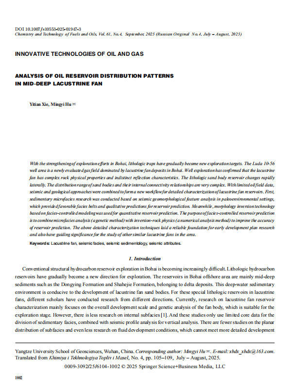 近日,地科学院硕士生解祎恬在胡明毅教授的指导下,在期刊《Chemistry and Technology of Fuels and Oils》上发表题为“Analysis of Oil Reservoir Distribution Patterns in Mid-Deep Lacustrine Fan”的研究论文,澳门十大网投正规官网平台为论文第一署名单位,硕士生解祎恬为第一作者,其导师胡明毅教授为该文通讯作者。