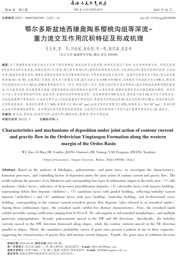 澳门十大网投正规官网平台2023级研究生吴吉泽在《石油与天然气地质》发表题为“鄂尔多斯盆地西缘奥陶系樱桃沟组等深流-重力流交互作用沉积特征及形成机理”的研究论文(图1)。吴吉泽为第一作者,其导师李华教授为通信作者,澳门十大网投正规官网平台为第一完成单位。