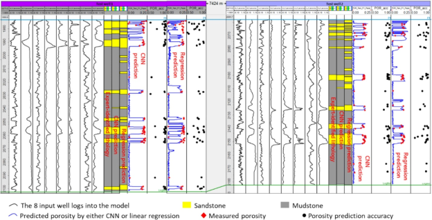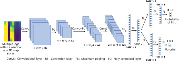 岩性识别和孔隙度预测是油气勘探开发及储层评价中的关键环节,对油气储量评估、储层建模以及地下资源开发具有重要意义。传统方法通常依赖测井曲线交会图、经验公式或统计学习方法,但这些方法往往仅利用单个深度点的测井信息,难以充分挖掘测井曲线在垂向邻域中的地质信息,因此在复杂储层条件下预测精度仍然有限。针对这一问题,该研究提出了一种基于深度滑动窗口和卷积神经网络的联合预测方法。该方法通过构建滑动窗口提取目标深度上下范围内的多种测井曲线信息,并将其转换为二维数据结构作为输入,利用卷积神经网络自动提取特征并预测窗口中心位置的岩性类型与孔隙度。当滑动窗口沿井筒垂向移动时,模型即可快速完成整个井段的连续预测,实现高效、自动化的测井解释。研究团队利用中国东部某油田289口井的测井数据对方法进行了验证,数据包含伽马(GR)、自然电位(SP)、深电阻率(RLLD)、声波时差(AC)、井径(CAL)等8类测井曲线。实验结果表明,当滑动窗口长度为1.125 m时模型表现最佳,其中,岩性识别准确率可达到94.4%,孔隙度预测准确率达到94.9%。研究结果表明,该方法不仅预测精度高,而且计算效率快,可在油气田新井和老井资料解释中快速推广应用,为智能测井解释和油气储层评价提供了一种新的技术思路。该研究得到了澳门十大网投正规官网平台油气资源勘探技术教育部重点实验室开放基金以及中国石油天然气集团公司创新基金等项目的资助。