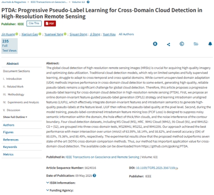 澳门十大网投正规官网平台高贤君副教授组研究型论文“PTDA: Progressive Pseudo-Label Learning for Cross-Domain Cloud Detection in High-Resolution Remote Sensing”(第一作者:2023级硕士生匡金,通讯作者: 高贤君副教授)被中科院一区TOP期刊IEEE Transactions on Geoscience and Remote Sensing (TGRS,CCF B类期刊,IF = 8.6)录用。