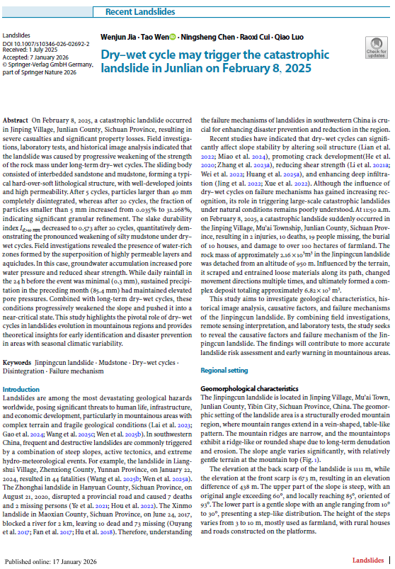 澳门十大网投正规官网平台博士研究生贾文君在工程地质领域顶级期刊《Landslides》(中科院2区SCI,IF=7.0)上发表题为“Dry-wet cycle may trigger the catastrophic landslide in Junlian on February 8, 2025”的研究论文。澳门十大网投正规官网平台为论文第一单位,博士研究生贾文君为论文第一作者,温韬教授为通讯作者。