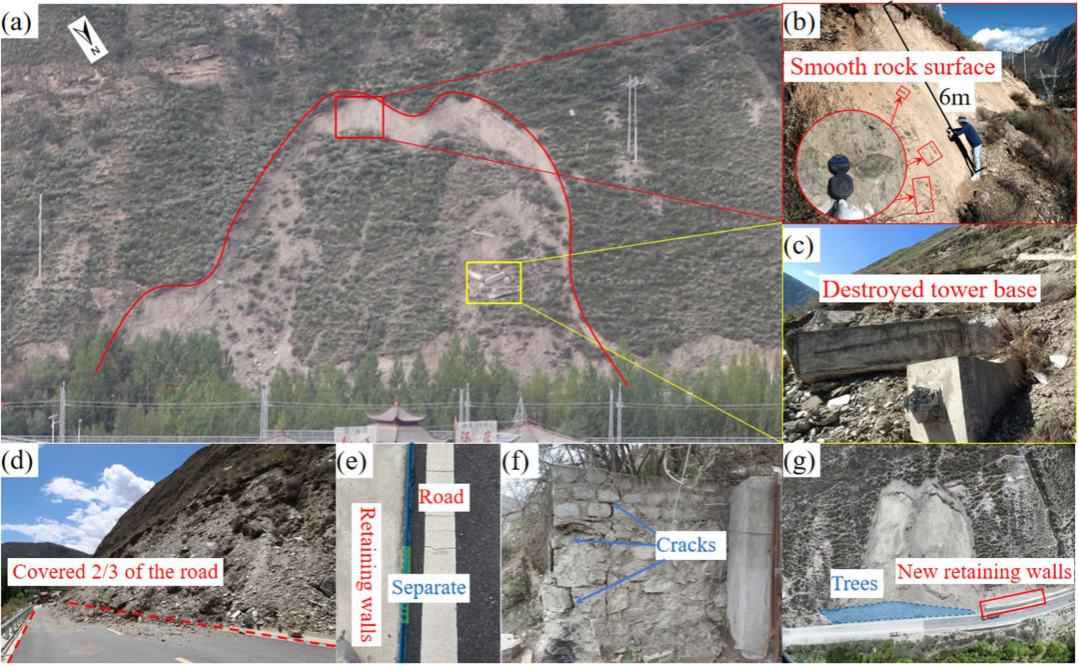图1 扎雪村滑坡变形特征:(a)全貌图;(b)滑坡后壁光滑岩体;(c)受损的电塔;(d)堆积体;(e)公路外挡墙后壁裂缝;(f)附近民居变形的围墙;(g)滑坡治理后航拍图.