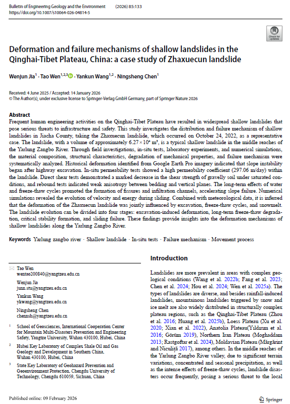 Jia, W., Wen, T., Wang, Y. et al.Deformation and failure mechanisms of shallow landslides in the Qinghai-Tibet Plateau, China: a case study of Zhaxuecun landslide. Bull Eng Geol Environ 85, 133 (2026).https://doi.org/10.1007/s10064-026-04814-5