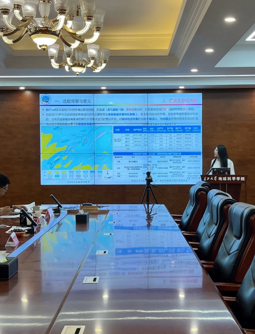 费娥的学位论文题为《自215井区龙马溪组一段页岩裂缝特征及发育规律》,在导师李涛副教授的指导下,论文以自215井区龙马溪组一段为研究对象,通过多方法联合的“点-面-模式”裂缝发育特征识别及规律分析,建立了压扭-走滑构造体系控制下的9种页岩裂缝发育模式,认识到研究区主要发育近NE向、近SN向、NW向及EW向四组裂缝,发育裂缝类型以剪切缝为主,产状以斜交-中高角度裂缝为主;裂缝发育多与挤压应力相关,NE向与近SN向裂缝为一组受早期NW向挤压应力形成的共轭剪切裂缝,NW向与EW向裂缝为一组共轭关系,主要受渐新世以来持续的NE向挤压应力影响,受早期NE向构造形成;建立了9种裂缝发育模式,基于页岩油气的富集规律,结合构造特点,将建立的裂缝发育模式应用到自215井全区,优选出自215井区龙马溪组一段的页岩油气勘探开发有利区带为研究区NE向断层周缘,特别是断层上盘、背斜的翼部位置剪切裂缝较为发育的位置。研究中形成的地震分频属性优选裂缝识别技术、井-震联合地震反演裂缝预测技术对页岩裂缝发育识别效果好,且可靠性较高,分别达到了72.25%、80.8%,可为其他相似地质情况下的页裂缝识别提供借鉴;研究所建立裂缝发育模式有一定的普适性,可作为构造因素主控下页岩裂缝发育特征识别的理论指导。