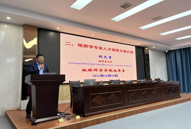 胡忠贵主任从学院和地质学的办学历史、师资力量、实践平台、人才培养等方面做了详细介绍。从通识课程、主要专业课程、专业实习实践等方面需要达到的要求给同学们详细介绍了地质学专业的人才培养方案。