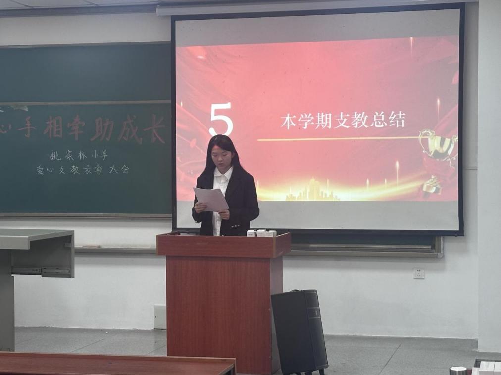 颁奖结束后学生会成员王誉晗对上学年支教活动进行总结,分享在过去一年组织支教活动过程中的收获,代表部门全体成员感谢大家对活动的支持,同时宣布本学年支教活动开启,号召大家继续积极参与支教活动。