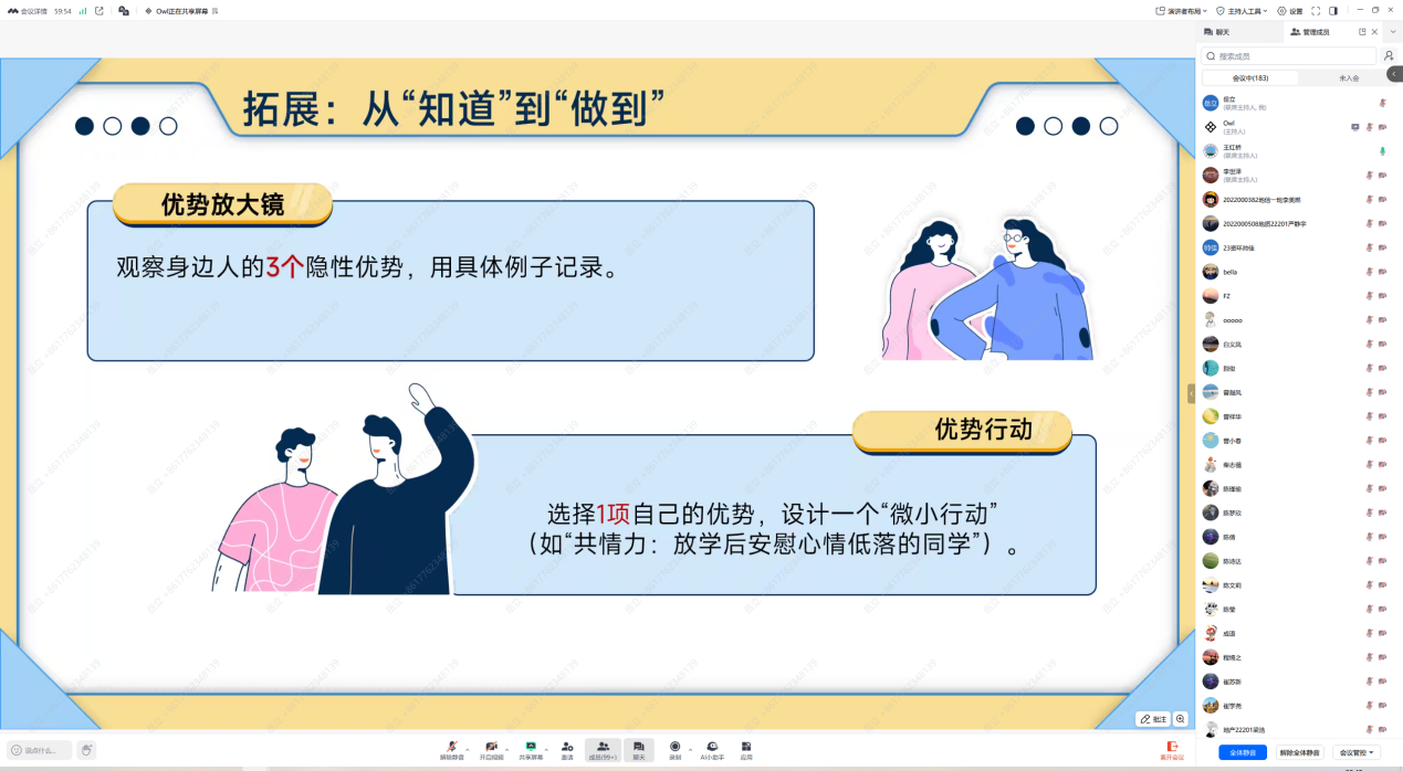 (通讯员 郝兴瀚)为筑牢校园心理防线,5月22日、23日晚,十大网投正规官网心理专干王红桥老师在13教B122主讲“认识自己,悦纳自己”心理健康培训,2024级141名学生骨干现场参与,线上本、研究生各年级累计452人通过腾讯会议同步学习。 王红桥老师从生理自我、心理自我、社会自我三个维度展开对自我认知的讲解,并分享增强自我认同的两个自我探索的方法:“20个我是谁”、“每日优点记录”,她还介绍了“优势卡牌”,引导同学们通过与他人的互动发现潜在优势。结合大学生心理困惑案例,王老师带领同学们剖析自我认知偏差的成因与表现,深化了大家对自我认知的理解。对于如何悦纳自己的缺点与不足,王老师用具体生活事例说明不同特质在学习、生活和职业发展中的作用,并分享“优势探索表”,指导大家转换对缺点的看法和评价,提升心理健康水平。 此外,王老师强调了学生骨干在校园心理健康工作中的重要作用,邀请大家履行职责,以身作则做示范、宣传知识、关注同学动态并及时反馈、推荐有需要的同学寻求专业帮助。培训最后还介绍了心理中心的服务项目与学校四级心理危机干预体系的运作机制,呼吁大家积极参与心理健康教育,共筑校园心理防护网。 (审核 冯舒 编辑 王红桥)