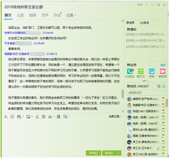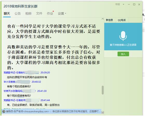 (通讯员 张严)为强化寒假安全教育工作,认真做好2018级期末考试分析总结工作,十大网投正规官网于2019年1月26日晚8点在“2018级地科新生家长群”中召开了2018级本科生第二次线上家长会,学院党委副书记任倩、辅导员潘志远以及学生家长共计160余人参与了讨论,家长会由年级辅导员王宁主持。
