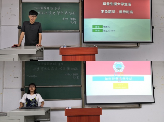 在地质专场上,首先是来自资工21504班的单鹏飞学长,他先介绍了他的大学生活,还展示了班级的自制毕业视频,接着从理论学习、学术研究和工作生活等方面分别讲述。在学习方面,他叮嘱大家一定要珍惜实习和在实验室的机会,认真对待每一门考试,通过四六级,并积极培养兴趣爱好,做到全面发展;在工作方面,要积极参加各种社团活动,一丝不苟完成手头的工作;在人际交往方面,要处理好与同学和室友的关系。来自地质21502班的吴兰军先和大家分享了自己的日常学习和专业课学习,她说到高数和英语是两门非常重要的学科,希望大家能学好这两门学科并且一定要培养自己的对专业的兴趣,全力学好专业课。接着分享了她的学干经历,在院会和各大校级组织内,主要负责网上新闻撰写、官Q运行等工作,以此激励大家认真学习,认真工作。