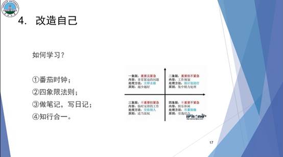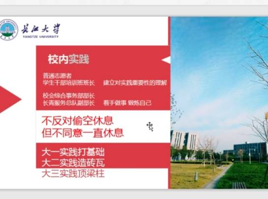 30日晚7点,樊柯廷、李康、王明敏3名同学分别进行学习经验分享。首先为我们做分享的是樊柯廷。他从自己的实践经历告诉我们,想做好一件事,你必须要有积极的态度,紧接着他又说“大学可以偷空休息,但不能一直休息,因为大学的意义不仅仅局限于宿舍。”最后,他告诉同学们,“大一实践打基础,大二实践造砖瓦,大三实践顶梁柱。”你可以通过一些企业实习,明白你更适合于什么岗位。紧接着,为我们做分享的是李康。他谈到大学生活要有明确的目标,目标就像你深夜航海时的灯塔。同时也认为大学并不是高中老师所讲的那样绝对自由。在大学,你必须学会自律,才能使得你的目标更加坚定。最后便是要务实,拒绝虚假,在实践中不断探索,这样才能更加深刻地去了解任何一件事。最后是王明敏为同学们分享经验。她先从自己方法讲起,她表示自己每天都会把要做的事列一张表格,这样就可以均衡地分配时间。同样地,态度也决定着你能否做好一件事,当你有求真务实的态度,就没有什么事能够难倒你。