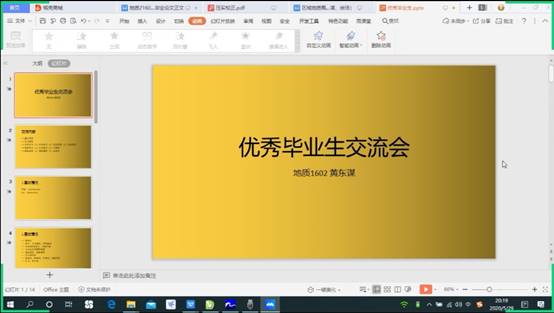 31日晚7点,首先向大家交流分享的是来自地信21601班的柯莹同学,她分别从学习方面、学干方面、课外实践方面跟同学们交流分享。学习上,她介绍了英语四六级的重要性和自己的备考方法;同时也告诫学弟学妹们要认真对待专业课,最后还分享了一短话:“去做你想做的事吧,不会有比现在更好的时机了。”在柯莹同学介绍完后,由来自地信(产业)21601班的李鹏同学跟大家分享交流,他先进行了简单的自我介绍,紧接着分享了自己大学期间的学习生活等,主要向大家交流了自己在考研过程中遇到的困难和解决方法,他认为考研相当于两个战场,一个是信息收集战,一个是精力持久战,最后他还给同学们提出了三个建议:一是以学习为主,学干为辅;二是多交朋友;三是认识自己,合理规划。最后,是由来自地信21602班的卜明伟同学与大家分享交流。关于大学学习,他在分享经验的基础上,还详细介绍了学院每年课程学习的重点,同时告诫大家不要挂科,因为一旦挂科可能会错失很多机会。最后,卜明伟將大学总结为“认真、刻苦、谦逊”三个词,并以一首诗来结束分享。“胸怀鸿鹄之志,必展骐骥之跃……厚积分秒之功,定将一鸣惊人。”
