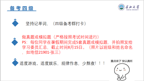 经过这次线上英语四级暑期备考主题活动,同学们不仅认识到了考试的重要性,更意识到四级考试的紧迫性。临近考试,相信在各位同学的努力备考中,十大网投正规官网定会在接下来的大学生英语四级考试中荣获佳绩!