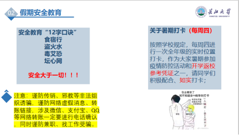 会议伊始,辅导员先就暑期安全教育工作进行了强调,传达了学校关于暑期的工作安排及秋季开学时间等内容。紧接着,罗老师从“返荆返汉不返校”、“异地流动”和“安全教育12字口诀”三方面展开了安全教育,在确保学生及时报备地域流动情况的同时,还提醒同学们要注意人身安全及财产安全。