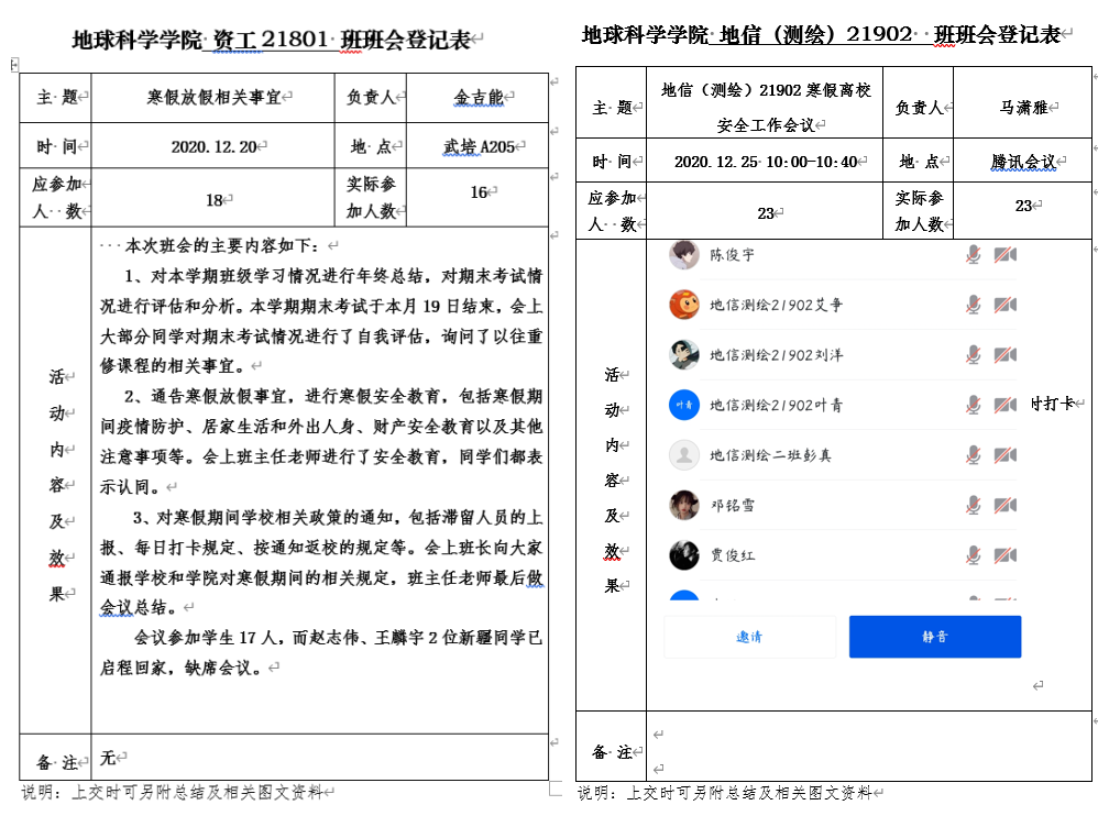 主题班会由各班主任老师组织召开,班主任老师从寒假前、返回途中、寒假中、返校前和违纪处理五个部分向同学们提出了具体的安全及防控要求:所有在校生圣诞节、元旦节不得外出、不得参加校内外聚集性活动;如实填报假期行程,“一人一档”制定台账;同学们离校后必须直接回家,校家两地一线,不得中途改变行程;未经批准,一律不得私自返校、提前返校;如违反学校疫情防控要求将受到纪律处分。部分班级还开展的了期末复习动员会及考试诚信教育。