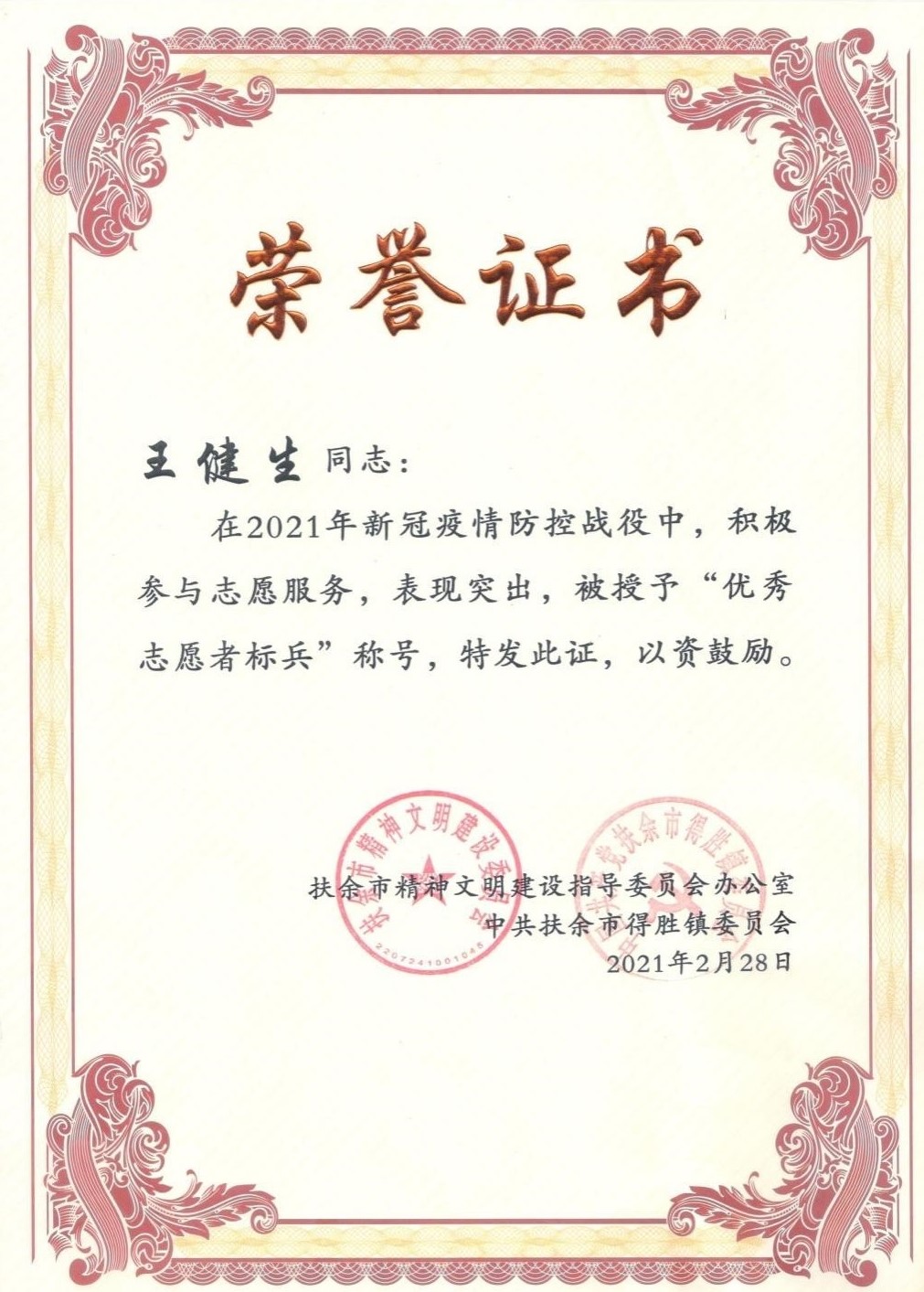 王健生凭着热情、认真、负责、贡献的态度,被当地政府授予“优秀志愿者标兵”称号。回忆这段志愿者经历,他说:“我只是青年浪潮中的一员,看到那么多奋战在一线的医生、护士、警察和来自各行各业的志愿者,我渴望加入他们,和他们坚守在一起,用实际行动为青春添彩。”