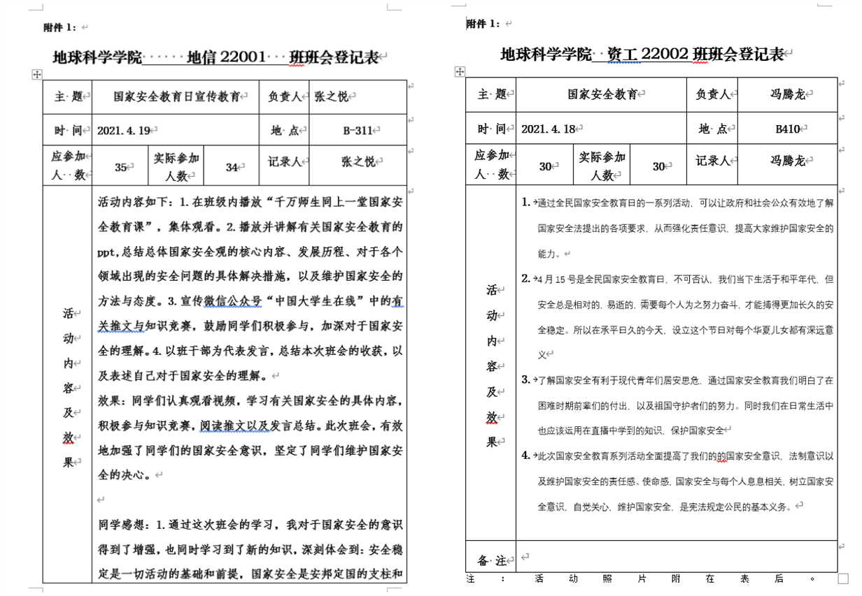 主题班会上,同学们积极发言。地质22001班李纾羽同学说:“在‘全民国家安全教育日’到来之际,我们要牢牢抓住这一机会,充分利用网络、媒体、宣传栏等媒介,将国家安全的重要性、如何守护国家安全的方式、方法等问题对广大人民群众进行宣传、教育和引导,让国家安全意识更加深入人心,激发出每个人都参与国家安全守护的动力。”资工22002班冯腾龙同学说:“此次国家安全教育系列活动全面提高了我们的国家安全意识,法治意识以及维护国家安全的责任感、使命感,国家安全与每个人息息相关,树立国家安全意识,自觉关心,维护国家安全,是宪法规定公民的基本义务。”