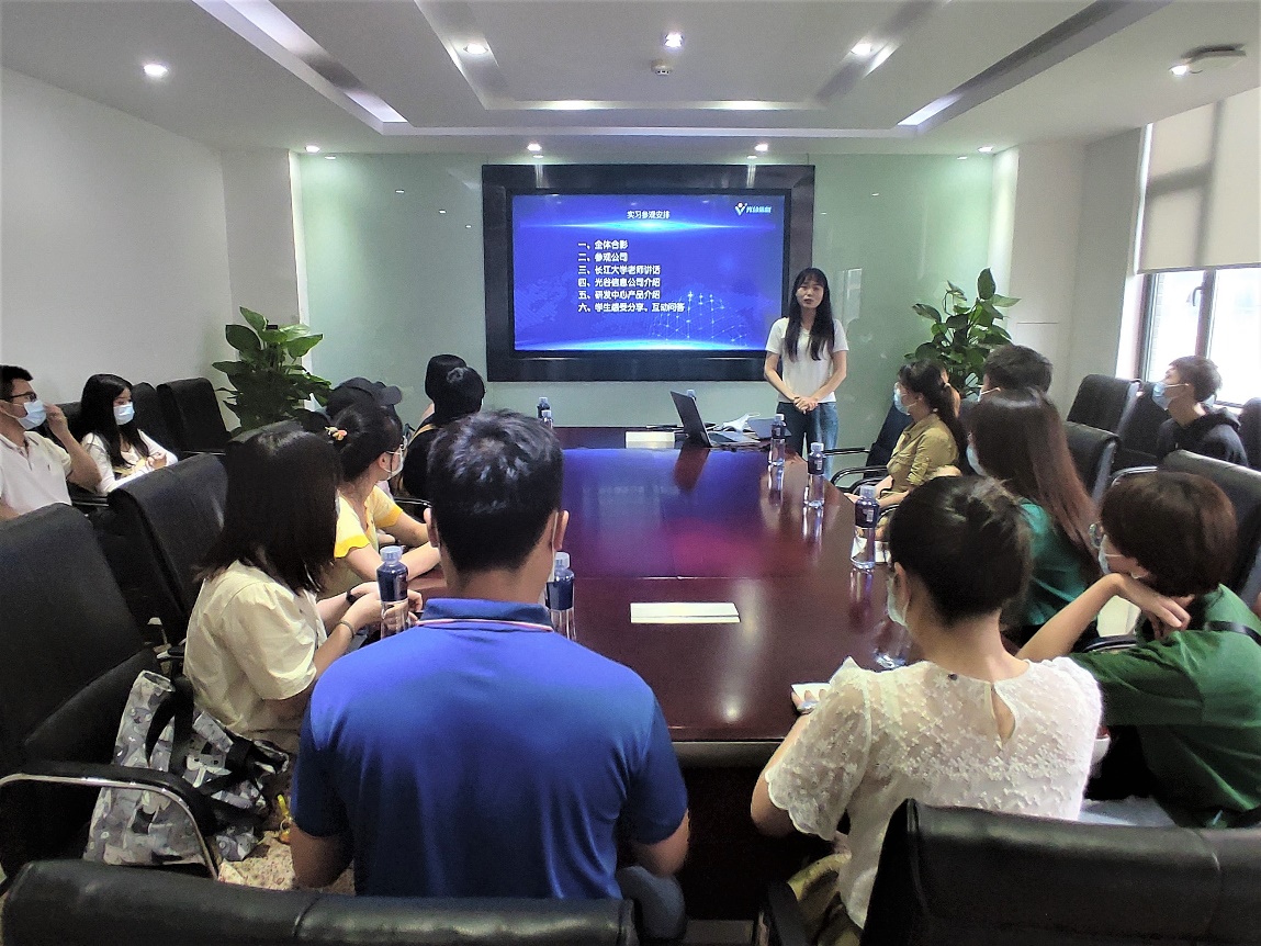 参观完整洁的办公环境,同学们一起来到了四楼会议室。郭霖老师首先对光谷信息提供的机会表示感谢,并为公司良好的企业氛围和办公环境点赞;她希望同学们借助今天这个机会,带着专业的疑问和对未来规划的思考用心地来进行交流。接着,她提出了同学们要实现三个转变:“第一是要实现从学校学习的知识到和实践相结合的转变,要能够理论联系实际;第二是要实现从学生到职业人的转变,尽快改变观念去适应工作;第三是要实现从一个普通公民到社会人的转变,承担起自己的社会责任。”她寄语:“同学们要把自己的命运和国家联系到一起,要立大志、长志,争取为学校、为行业、为祖国增光添彩。”