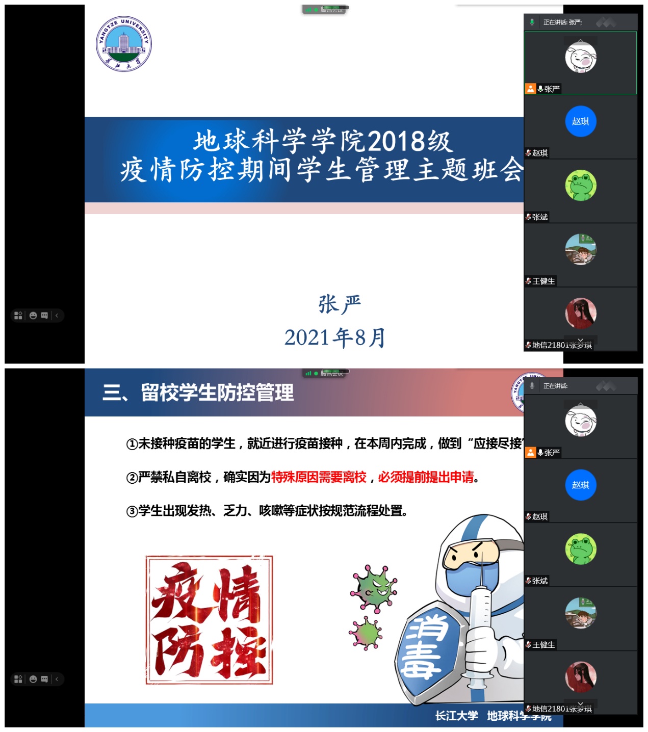 8月11日,各年级辅导员用腾讯会议组织召开主题班会。会议首先向全体同学强调了国内目前疫情动态,带领同学们再次学习了荆州市、武汉市、学校多层次的疫情防控政策,并向同学们强调要无论身在何方,一定要遵守当地防控规定。其次,分留校学生和校外学生两类群体,向大家梳理并强调了防控细则,主要包括坚持并诚信开展每日健康打卡;非必要不外出,严禁私自离校与返校,如要离校与返校必须提前提出申请;未完成疫苗接种的同学,要就近进行疫苗接种,做到“应接尽接”;出现发热、乏力、咳嗽等症状,应第一时间通知社区及辅导员;对处于中高险学生和健康码、行程码出现异常情况学生,“一对一”了解行程,并跟踪做好疏导、安抚、资助工作等。