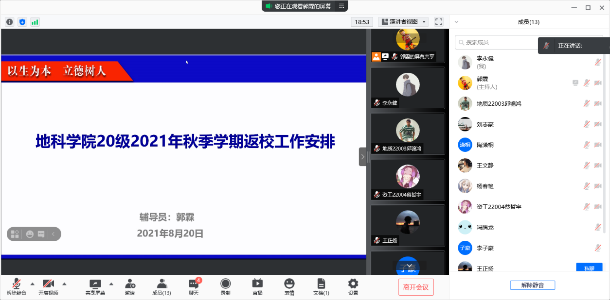 (通讯员 李永健)为确保2021年秋季学期开学返校工作平稳有序开展,十大网投正规官网按照疫情防控要求以及8月15日学校发布的《关于做好2021年秋季学期开学准备工作的通知》,于8月20-22日用腾讯会议的形式在全体学生中召开了“地科学院2021年秋季学期返校工作安排”主题班会。