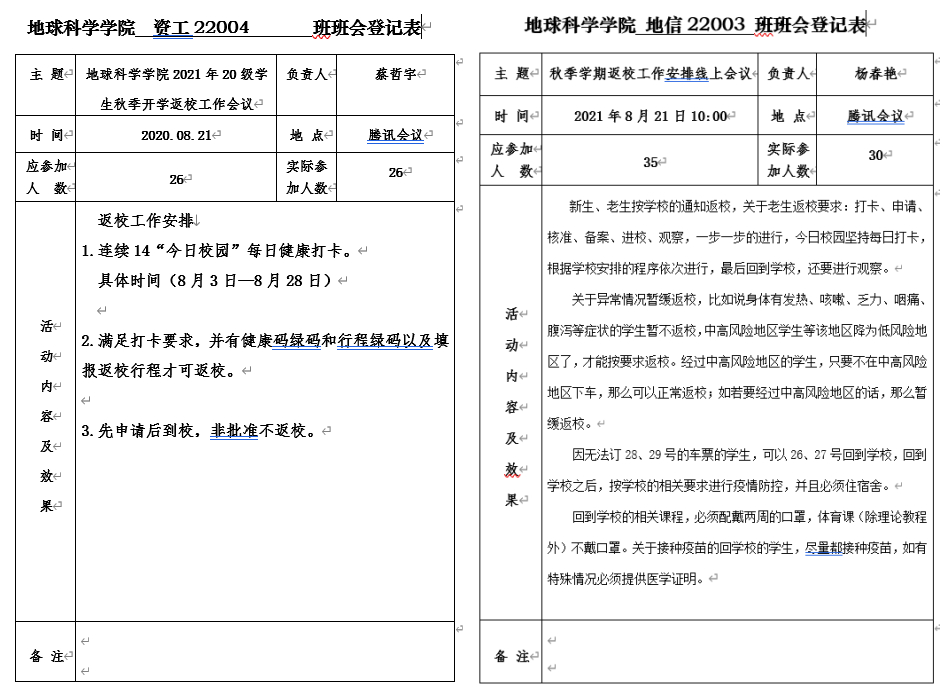 主题班会由各年级辅导员负责,并分两步进行。第一步先由各辅导员组织召开班长及安全员会议,会议主要从返校流程要求、常见问题、疫苗接种、日常防护等方面展开。重点强调了要严格遵守学校的疫情防控及开学返校工作要求,不得私自返校;同时要求坚持每天打卡,非必要不出门,保证自己的健康绿码和行程绿码,积极接种疫苗。第二步由各班班长组织召开班级会议,确保学校及学院疫情防控及返校工作精神无一遗漏传达给每位同学,并组织同学们填写返校申请审批表。