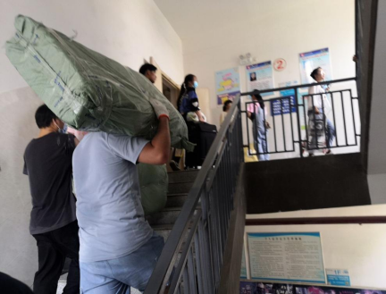 9月4号上午是报道高峰期,37℃的骄阳挡不住学生党员为新生服务的热情与激情。10时许,党委副书记任倩来到4栋时,看到党员们的T恤都已经湿透,问起他们,资工22004班蔡哲宇摆摆手“两个小时内,我跑了七趟6楼,就当锻炼啦”。女生衣物行李较多,常常需要“四对一”甚至“六对一”“八对一”服务。但大家没有叫苦喊累,而是主动服务,送到对应的寝室门前。测绘QX211班钟康说,“天气虽热,服务不能打折。一个党员就是一面旗帜,胸前的党员徽章,手臂上的红袖章,地科院的志愿者们就是开学季最美丽的风景线!”