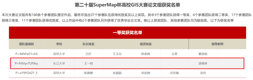 (通讯员 徐业兴)2022年9月8日,《第二十届SuperMap杯高校GIS大赛(中国赛区)论文组》获奖名单公布,十大网投正规官网20级研究生王一鸣在导师邵燕林的指导下,凭借《基于地质特征的空间检索方法》一文在全国160余个作品中突出重围,代表澳门十大网投正规官网平台获得了大赛一等奖。