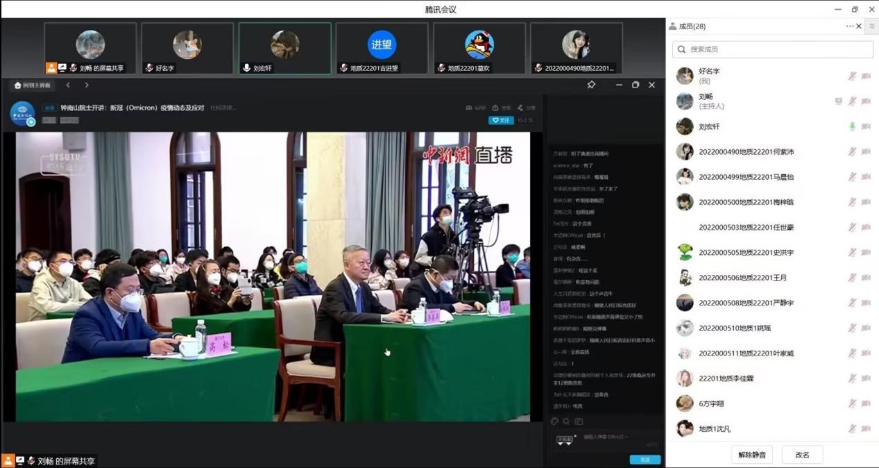 为加强学生的自我防护意识,让同学们更加科学理性地应对新冠(Omicron),12月15日下午15点,十大网投正规官网各年级共1900名学生通过腾讯会议等方式集体学习钟南山院士给全国高校学生上的《新冠(Omicron)疫情动态及应对》科学防疫大课。
