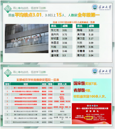 建设优良的学风,营造良好学习环境,是班级建设的重中之重。自开学以来来,同学们互帮互助,勤于开动脑筋,建立了“零挂科辅助集团”,致力于为同学们答疑解惑、分享解题思路。同学们善于向老师提问,认真完成作业。整个班级学习风气浓厚,生机勃勃,与老师积极配合,课堂气氛活跃获得老师们的一致好评。大二学年,我班同学共有两人获得“澳门十大网投正规官网平台一等奖学金”,两人获得“李建华一等奖学金”,两人获得“国家励志奖学金”,一人被评为“三好学生”,一人被评为“三好学生标兵”,一人被评为“十佳大学生”,共两人被评为“优秀学生干部”,多名同学获得“澳门十大网投正规官网平台单项奖学金”,两人担任校级组织重要负责人的角色。全班平均绩点3.01,四级通过率100%,六级通过率60%。在各类考试中,严肃考风考纪,未出现一例违纪现象。全班最高绩点为4.63,专业前十名本班有三位同学,多名同学通过计算机二级等专业认证。在辅导员和班主任的管理下,严谨的学风铸就了不怕苦不怕累的拼搏精神,良好的学习氛围也使班集体在全校脱颖而出。我班同学获得“第十一届全国大学生GIS应用技能大赛”全国一等奖;“第十五届全国大学生计算机设计大赛”全国三等奖一项、省部级一等奖一项;“全国大学生英语竞赛”全国三等奖;“易智瑞全国大学生GIS软件开发竞赛”全国三等奖两项;“第三届湖北省GIS应用技能大赛”特等奖;“第十二届全国大学生电子商务三创赛”湖北省一等奖;“蓝桥杯全国软件和信息技术专业人才大赛”省级三等奖。目前共有超半数的同学参加大创项目,其中国家级项目一项,省级项目两项,共发表一篇核心期刊、一项软件著作权,其中国家级大创项目“麦朴志愿”已正式投入使用。