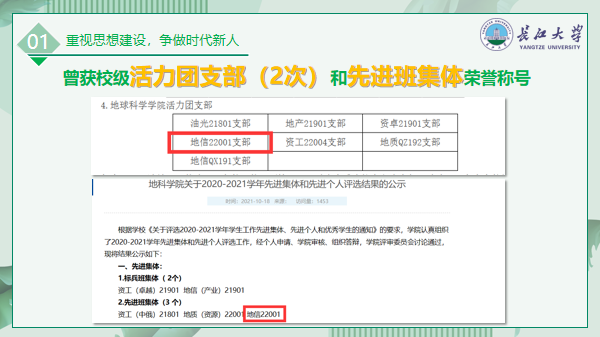 乘着和煦的秋风,2020年9月我们相聚在澳门十大网投正规官网平台地信22001班这个温暖的大家庭。这是个团结友爱的集体,我们在这里欢笑、合作、携手共进。这是个朝气蓬勃、有着强大凝聚力的集体,我们在这只属于我们的大学岁月里挥洒青春!这是个投身社会主义建设的集体,我们在这里与人为善、帮扶他人。两年多以来,在学院领导、辅导员以及众多老师的关怀和指导下,全班同学以“团结、奋进、感恩”的班级精神,团结进取,齐头奋进,在思想,学习,生活,文体各方面都取得了优异的成绩。