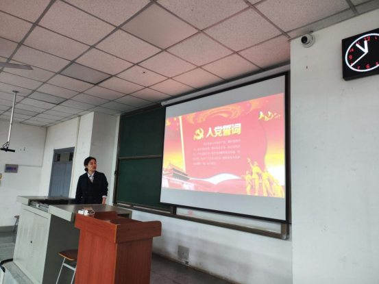 学院党委副书记冯舒分别从建党时期、抗战时期、解放战争时期、新中国成立时期和改革开放时期五个时期对入党誓词的历史沿革进行阐释。