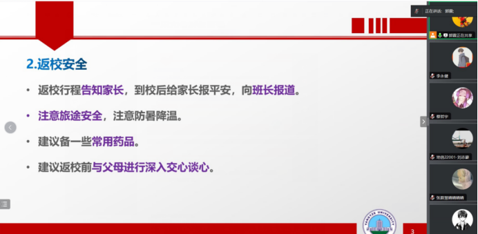 主题班会由各年级辅导员负责,分两步进行。第一步先由辅导员组织召开班长及安全员会议,会议主要从返校时间及要求、返校安全、返校打卡、秋季学期重点事项等方面展开。重点强调了要留心补考等重要时间节点,确保安全返校。第二步由各班班长组织召开班级会议,确保将学校及学院返校工作精神无一遗漏传达给每位同学,并告知相关注意事项。会后,辅导员对因各种原因无法正常返校的同学一对一联系,落实具体情况。