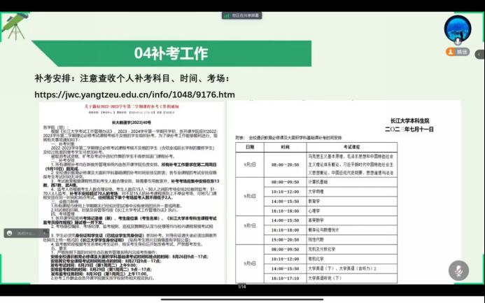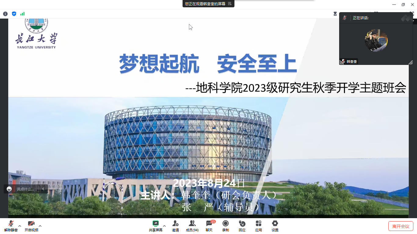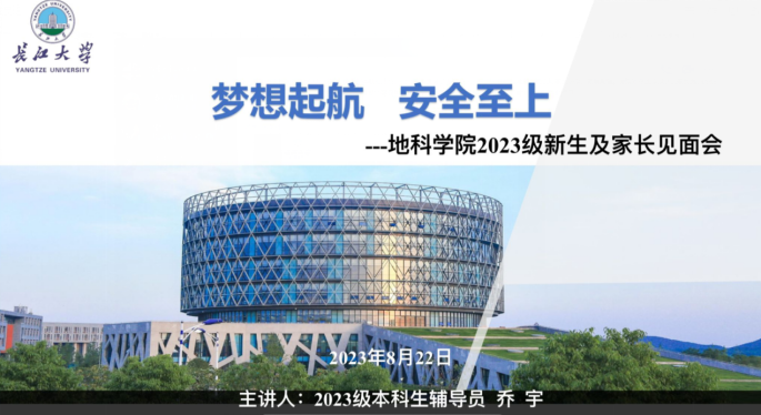 此外,2023级新生也于8月22日晚召开了“地科学院2023级新生及家长见面会”,辅导员乔宇老师分别从学校概况、迎新安排、开学前安全教育和大家关心的其他事项四个方面向新同学以及家长做了详细介绍。此外还邀请到了地科22301班班主任陈旭老师讲话,他寄语同学们珍惜大学时光,合理规划时间,树立远大理想,为社会主义现代化建设贡献自己的力量。最后乔老师对学生及家长的提问逐一进行解答,提醒同学们假期内要保障自身安全,期待在知音湖畔与同学们相见!